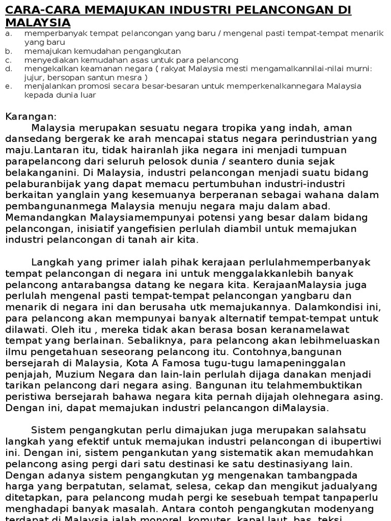 Panjang huraian anda hendak antara 200 hingga 250 patah kata. Kepentingan permainan tradisional. Industri pelancongan merupakan salah satu sektor yang di dapati semakin berkembang maju dan menjadi sumber pendapatan terpenting bagi Negara ini.